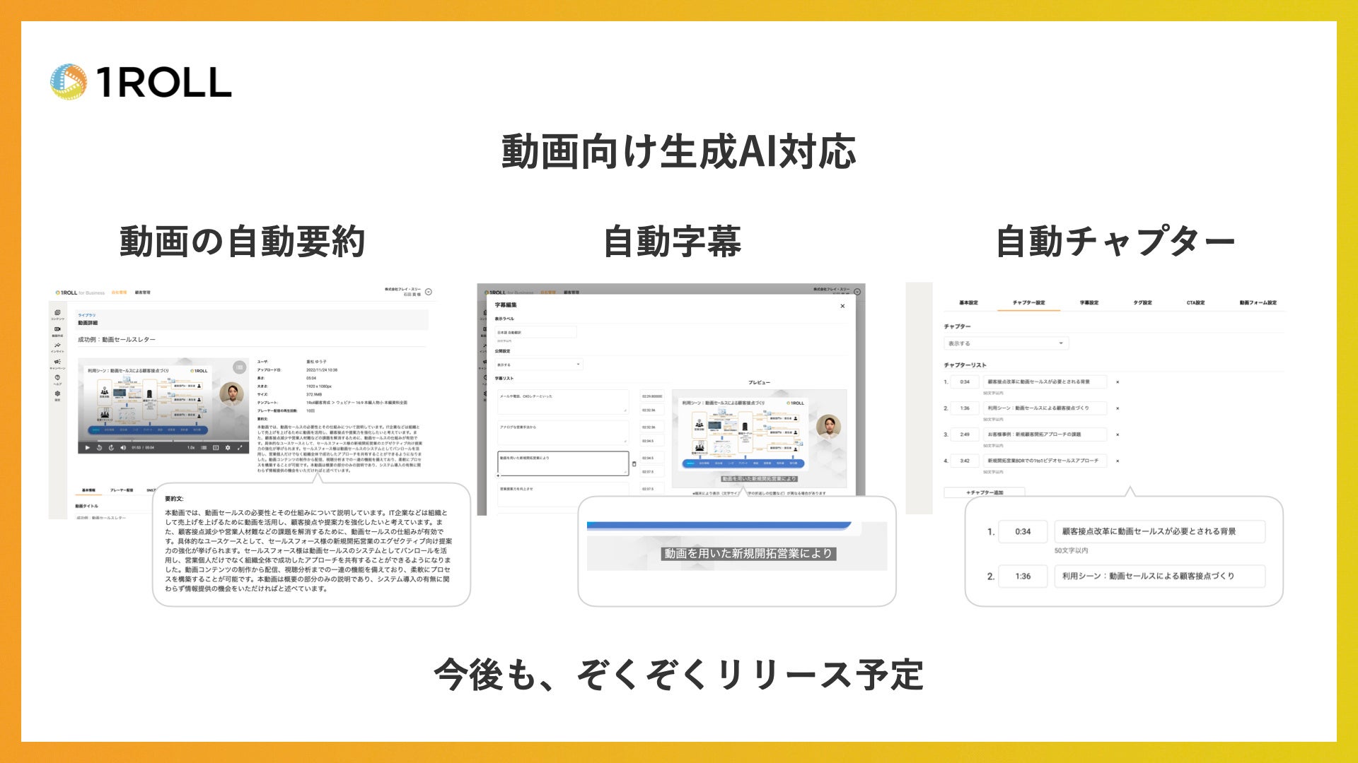 1ROLLはこれからもテンプレートのアップデートを継続し、お客様があらゆる業務で必要とする動画を迅速に作成できる環境を提供します。生成AI機能との組み合わせにより、より具体的で説得力のある情報伝達と業務時間の削減を同時に達成します。